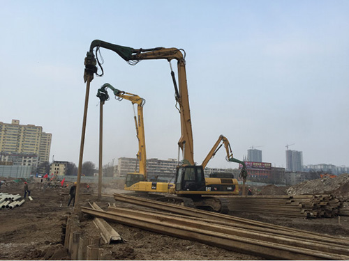 三、機械選擇。用振動錘打設鋼板樁,在樁錘和鋼板樁之間設樁帽,以使沖擊均勻分布,確保樁頂免遭損壞。