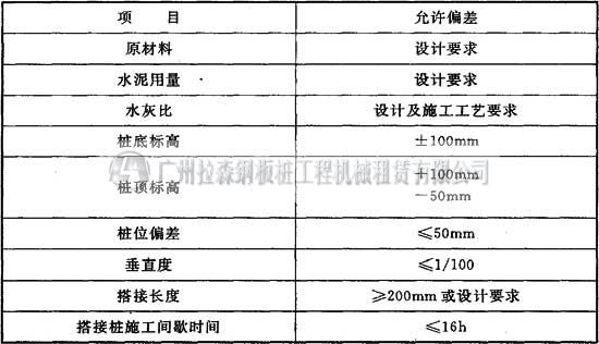 1 成樁施工期質(zhì)量檢測應(yīng)包括原材料檢查、摻合比試驗、攪拌和噴漿起止時間等,成樁施工期允許偏差應(yīng)符合表6.7.6的規(guī)定。