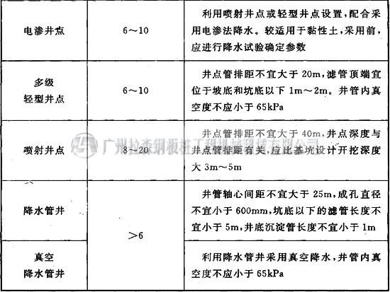 7.1.4 依據(jù)場(chǎng)地的水文地質(zhì)條件、基礎(chǔ)規(guī)模、開(kāi)挖深度、各土層的滲透性能等,可選擇集水明排、降水以及回灌等方法單獨(dú)或組合使用。常用地下水控制方法及適用條件宜符合表7.1.4的規(guī)定。